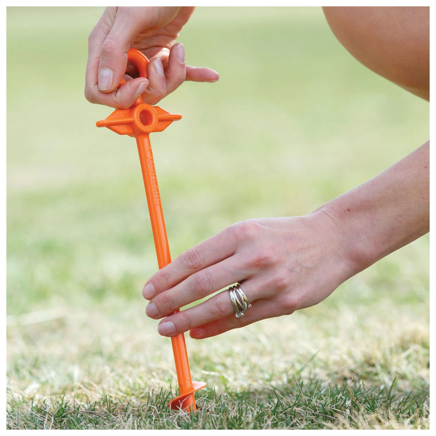 Bei diesem Zelthering handelt es sich um einen stabilen und zähen Bodenanker mit Gewinde. Er eignet sich optimal für sandigen und lockeren Boden. Er ist mit einer Öse ausgestattet, in die man Seile oder einen Hebel zum Eindrehen befestigen kann. Außerdem hat er einen Haken für die Zeltbefestigung.