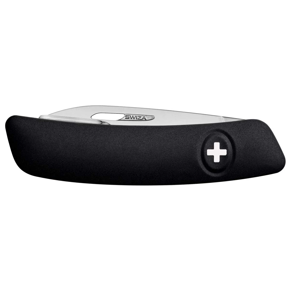Das Schweizer Messer D04 von Swiza liegt dank der leicht geschwungenen Griffschale und dem guten Grip fest in der Hand und lässt sich leicht bedienen. Die Arretierung der Klinge wird durch Drücken des Kreuzes entkoppelt. Sie verhindert das versehentliche Einklappen der Klinge während dem Arbeiten. Die durchgängigen Ausstanzungen ermöglichen Links- wie Rechtshändern das Ausklappen der Werkzeuge gleichermaßen.